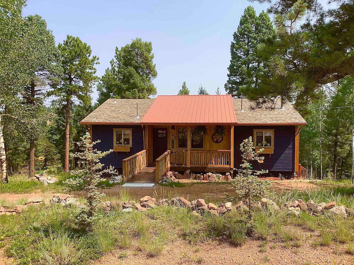 Newly remodeled cabin on 40 wooded acres. Accommodations up to 5 guests. Cabin is one of four built in the late 40's or early 50's. This is the last to be restored and now working to restore the 40 acres of forest and pond. This quiet location offers peace and serenity and a view of Pikes Peak. Deer, elk, fox, bear, coyote and even some moose have been seen on this property. Nearby Pike National Forest offers adventure for outdoor enthusiasts.