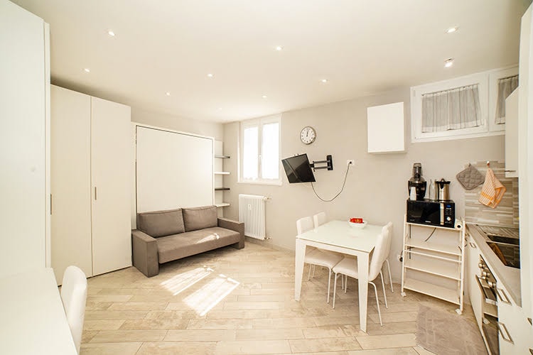 L’appartamento, totalmente rinnovato, si trova in una tranquilla via del quartiere Monti, al secondo piano di una scala dai gradini in pietra grigia, tipica delle torri medievali. Si compone di una spaziosa e luminosa camera dal soffitto a cassettoni di legno con letto matrimoniale, di un piccolo soggiorno con angolo cottura, completamente accessoriato, e di un bagno in marmo con doppio lavabo. L’arredo è di qualità e completato da stampe di raffinati manifesti degli anni venti.