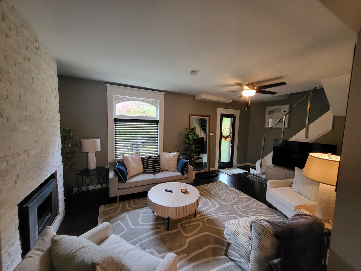 Our Boutique Luxury Brownstown provides guests with first class ammenities and style, while being one block from High Street and heart of the Short North with restaurants, shops + bars. Renovated in 2022, the space features original, refinished hardwood floors with a gorgeous stair, high end kitchen finishes with quartz tops, and two private en-suites with modern tile and oversized showers weith bench seats. If you are looking for an boutique experiance, there is nothing better in Columbus