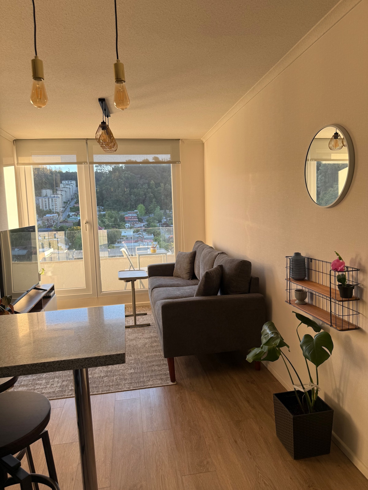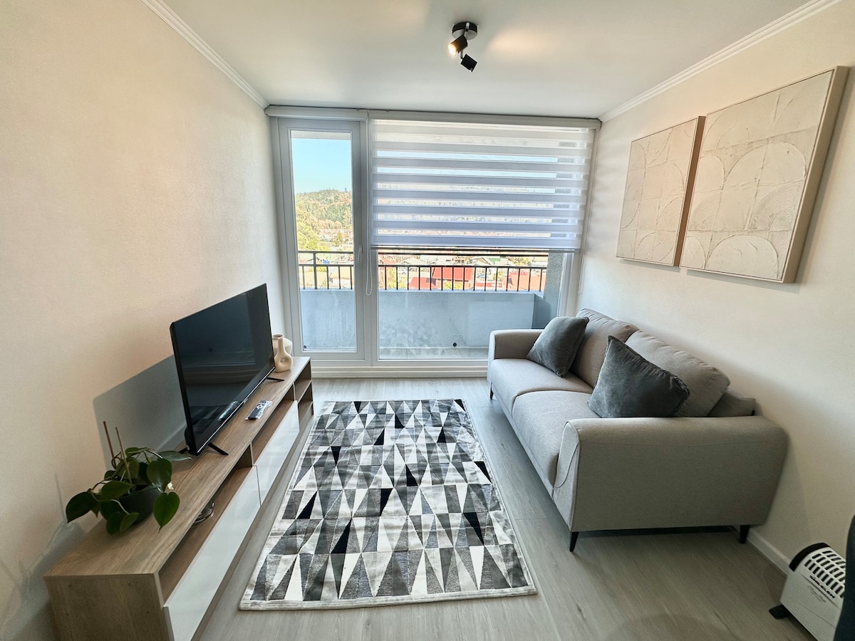 Modern 1-bedroom apartment on the 15th floor with panoramic views of Concepción and unique sunsets 🌇. Bright and cozy space, ideal for relaxing, working, or long stays. Features a comfortable living room 🛋️, fully equipped kitchen 👩🍳, fast Wi-Fi 🛜, TV with Netflix/Disney+ 📺, and a double bed 🛏️. Centrally located, just steps from downtown, universities, restaurants, and public transport 🚍. 🔔 Automatic discounts from 2 nights 😌