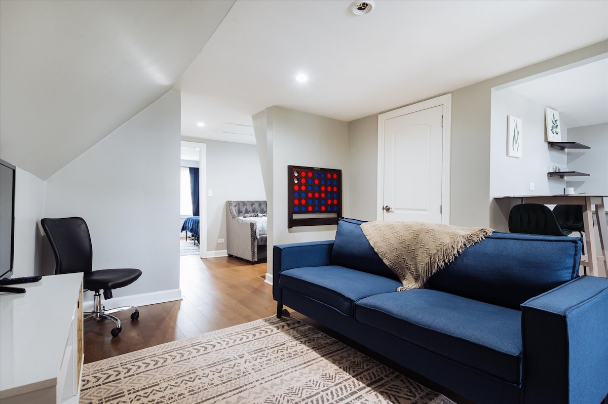 Enjoy this fun and unique 1-bed 1.5-bath speakeasy in the heart of Chicago's Bronzeville District. This artsy vibe features eclectic décor, hand-painted murals, Smart TVs, wet bar, wellness studio, remote workspace, free street parking, and ground-level-step-free access. This cozy space is perfect for fun couples, solo adventurers, business travelers, and game night aficionados. Easy access to Downtown (6 miles to Mag Mile, Navy Pier, Millennium Park), Beach (1 mile), Museums, & Sports arenas.