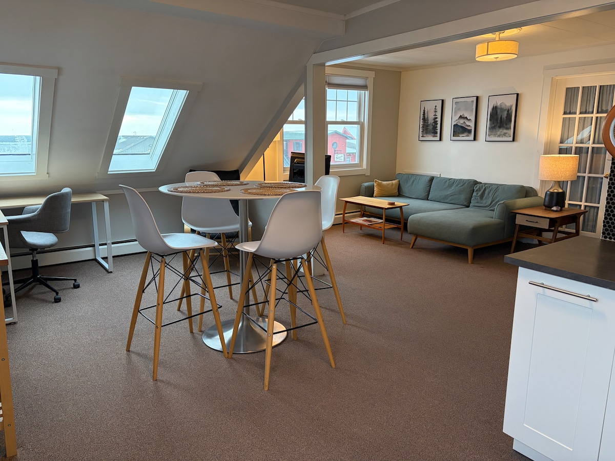 Absolutely ideal family vacation base in the heart of Grand and Marais. Incredibly spacious, clean and comfortable 2 bedroom with amazing views of both Lake Superior and downtown Grand Marais. This is a very impressive space for all guests but really designed well for families. Beautiful vaulted ceilings with fantastic wood paneling, slate tile floors, stainless appliances, great natural light, views for miles....perfect vacation rental