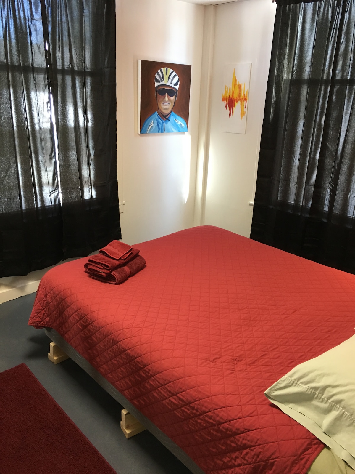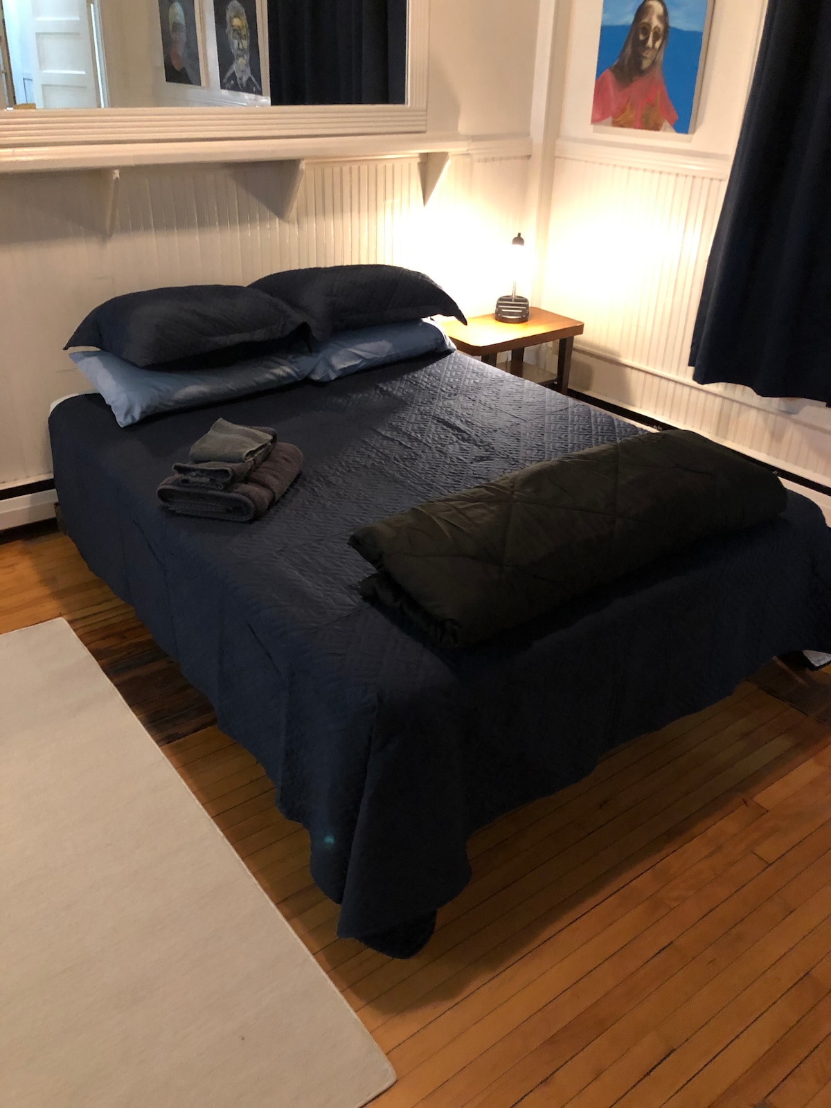 This is the largest room available in the Hostel. Features a queen bed and a single bed. Must climb stairs. Located on the second floor of the hostel. The kitchen and 3 baths share other guest rooms and dormitory space, minimizing how many people have access. For larger parties of up to 9 persons, book room number 12 (you will need to contact the host directly about reserving 3 people in the dorm room), and you will have the entire second floor. Note the winter parking policy.