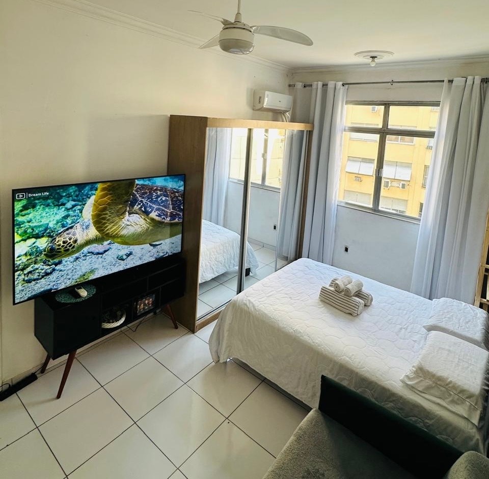 Siga em @marte.copacabana. Recém reformado, a 100mt da praia de Copacabana, altura do posto 5, há poucos minutos a pé do Arpoador e Ipanema. Studio funcional para até 3 pessoas, totalmente equipado com ambientes integrados: cozinha, banheiro e dormitório de altíssimo padrão. Cozinha com ilha e fogão (4 bocas) geladeira, airfryer e utensílios, perfeita para quem ama cozinhar. Para o conforto: split, Projetor Epson, cama de casal, roupa de cama de linho, máquina de expresso e Alexa.