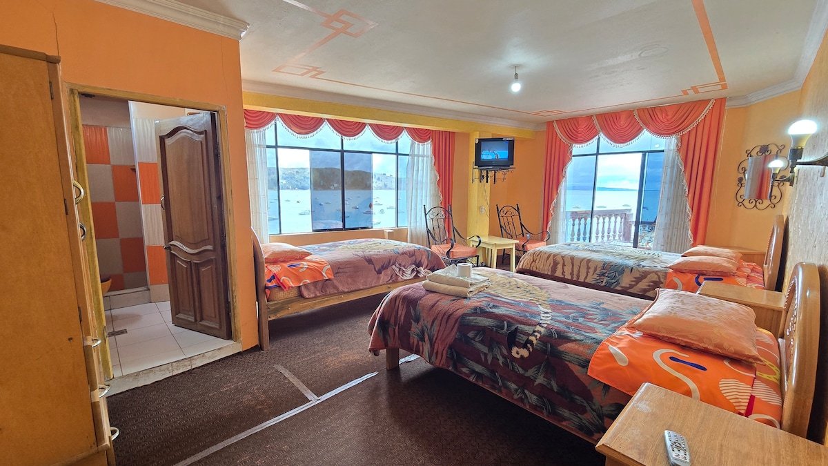 Hermosa habitación familiar dúplex en cuarto piso, muy cómoda con cuatro camas y dos sofá camas, cuenta con dos baños completos, bellísima vista de el lago Titikaka. El hotel se encuentra sobre la playa del lago, en zona tranquila, el hotel tiene garaje, areas comunes de recreacion, el desayuno esta incluido.