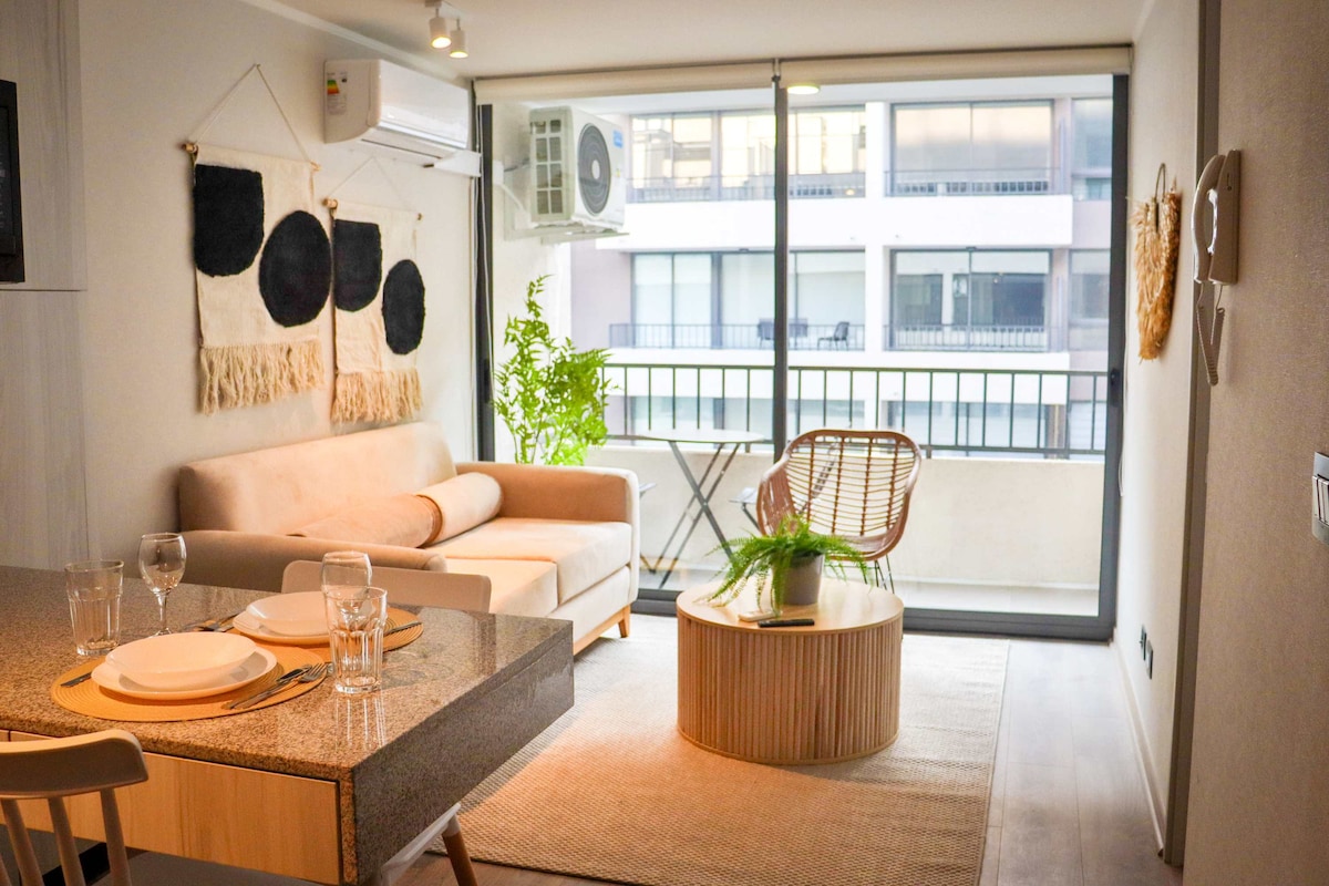 Stroll to the river from a mid-century modern apartment. Relax on a sunny balcony surrounded by cacti & trees. Inside is a completely refurbished studio flat in a 1960s building in the heart of Providencia. The space has lovingly maintained parquet floors and spirited modern art on the walls. Upscale unit just steps from Pedro de Valdivia Metro. 430 sq ft of high ceilings, exotic plants & unique design. Extra comfortable bed, speedy wi-fi & a gorgeous balcony for the perfect stay in Santiago.