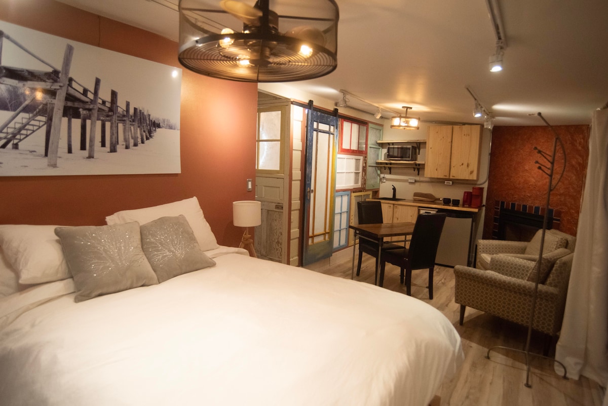 Every season is beautiful here! Especially in the most beautiful area in Saskatoon. This approximately 250-300sf space is a one of a kind space is located in the oldest neighbourhood in Saskatoon. Sit in two cozy chairs around the gas fireplace or rest in the duvet bed while watching the 50" TV. Located in the heart of the city literately a 15 walk from downtown, Broadway, live theatre and many world class restaurants. It's a space you will not want to leave.