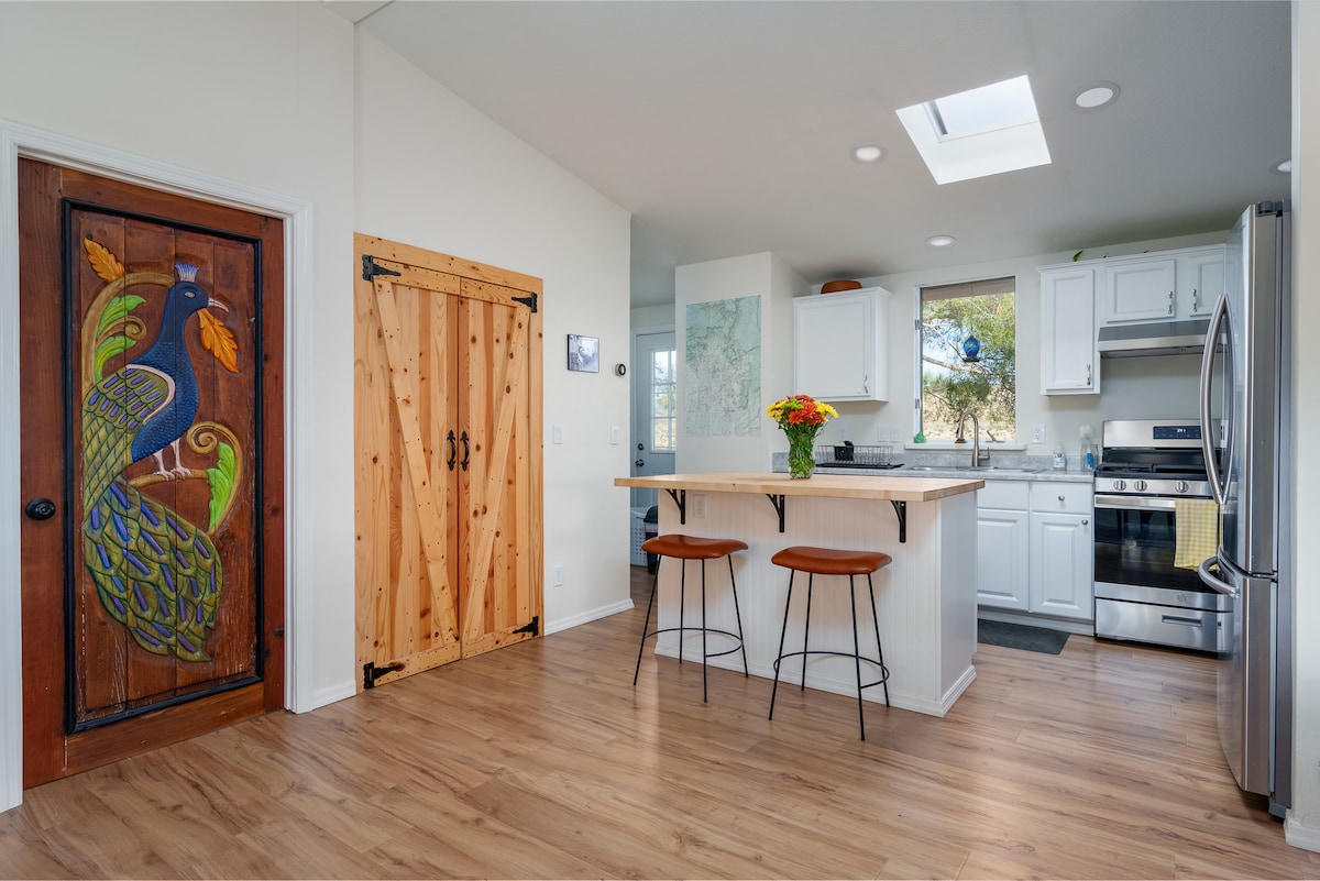 Wake up to hot air balloons drifting over the red rocks, greet friendly goats as you gather fresh eggs, or unwind by the fire pit beneath a blanket of stars. The Gem is a peaceful 2-acre cliffside retreat offering panoramic views—perfect for morning coffee or sunset wine. Starlink Wi-Fi, 32" Roku TV, full kitchen, washer/dryer, trailer parking, and a fully fenced yard—your furry companions ALWAYS stay free. Consistently rated among Sedona’s top stays with 600 + glowing reviews!
