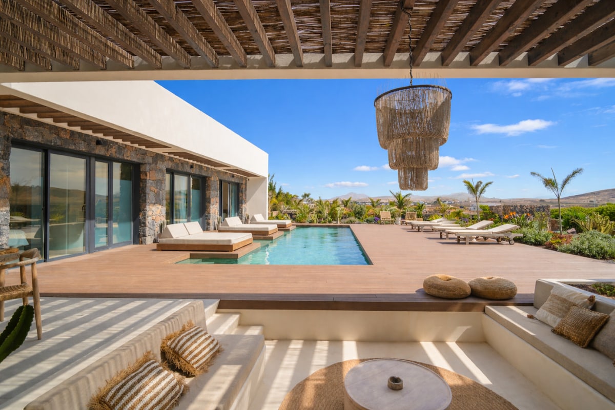 Villa NOMA is a recently renovated design space nestled in La Capellanía, near Corralejo and Lajares. An oasis that boasts a heated pool, 3 bedrooms, 2.5 baths, and a serene garden surrounded by swaying palm trees for the perfect indoor-outdoor experience. A project by 'Noogar Interior Design,' that blends a modern aesthetic with ethnic vibes and Mediterranean influences. A cosy and stylish holiday villa with pool where to enjoy an unforgettable, relaxing stay in Fuerteventura.