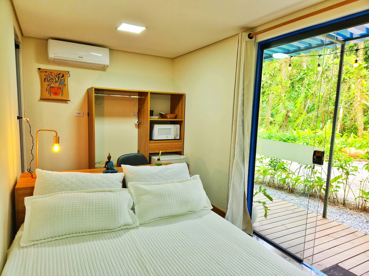 Nossa suíte em propriedade compartilhada é muito confortável e bem equipada. Tem cozinha, TV com Chromecast, ventilador, ar condicionado, armário, roupas de cama e banho, cadeiras de praia, cooler e guarda-sol. Tem varanda privativa com rede, mesa e sofá. Na propriedade há chuveiro, deck, lavanderia, jardim e espaço para Luau compartilhados. Estamos a 800 m da praia da Lagoinha e a 300 m das ruínas e cachoeiras. Há restaurantes, sorveterias e supermercados nas proximidades.
