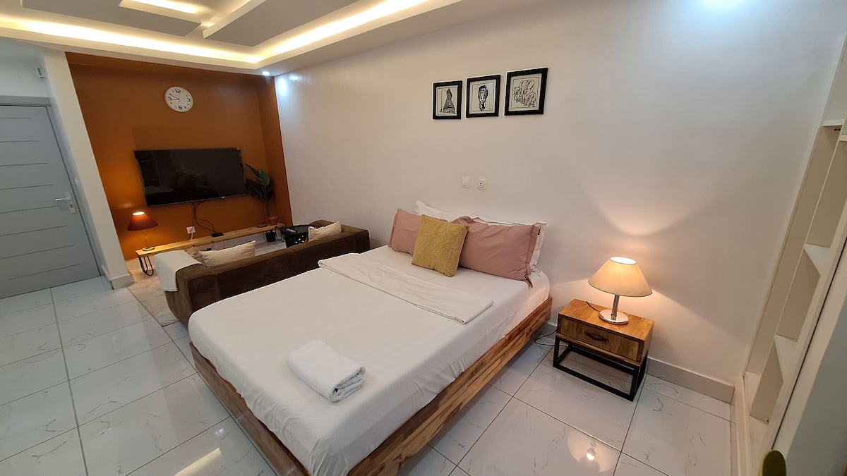 ★ ”..Alains Apartm. is well situated, he is a care taking..” Hortense ☞ 32” HDTV ☞ 50MBs Wi-Fi ☞ 7/7 Security Guard ☞ Water cooker for hot showers ☞ Air-Conditioner ☞ Free Parking » 9min drive to Kafolo Lagoon » 7min drive to Carrefour market » 30min drive to Airport Add my listing to your wishlist by clicking ❤️ the in the upper-right corner. If you have a 2+ reservation, you will need to use more furnitures than the bed. Don't worry we will show you how to use the other sleeping places.
