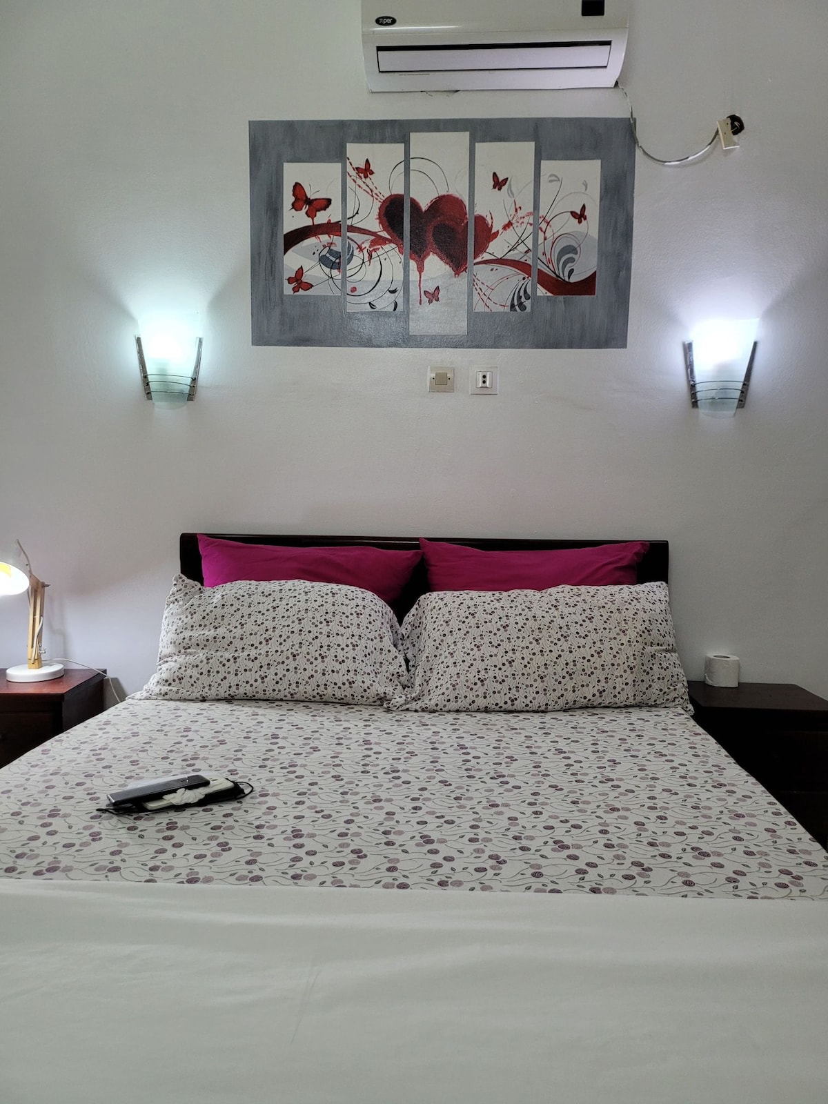 Beautiful studio with equipped kitchen, bathroom, office, wifi, air-conditionning, TV, in a green and peaceful property, with swimming pool in Abidjan, Riviera 3. Booking includes free weekly cleaning, bedsheets, towels, soap, and free laundry and ironing of guests' clothes. The pool and garden may be shared with other guests. An additional bed can be arranged for a 3rd guest. The property is peaceful and has many trees. It is 10 minute walk from shops and restaurants