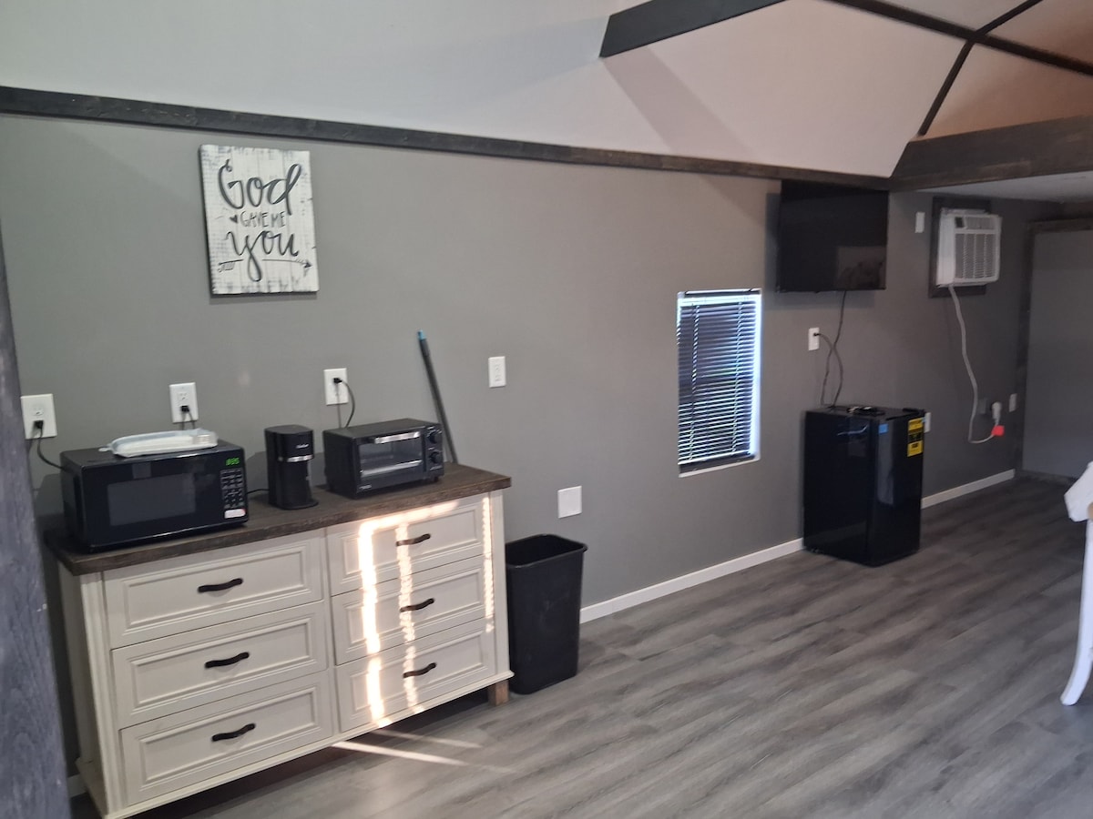Our Cabin 1 has a queen sized bed, a futon couch that turns into a full size bed that can sleep 2 people, mini fridge, microwave, toaster oven and coffee maker. A nice size bathroom with shower. It is conveniently located next to our wash/bath house which has a washer and dryer. This cabin is located on our 6 lot RV park. We also have a dog park and playground.