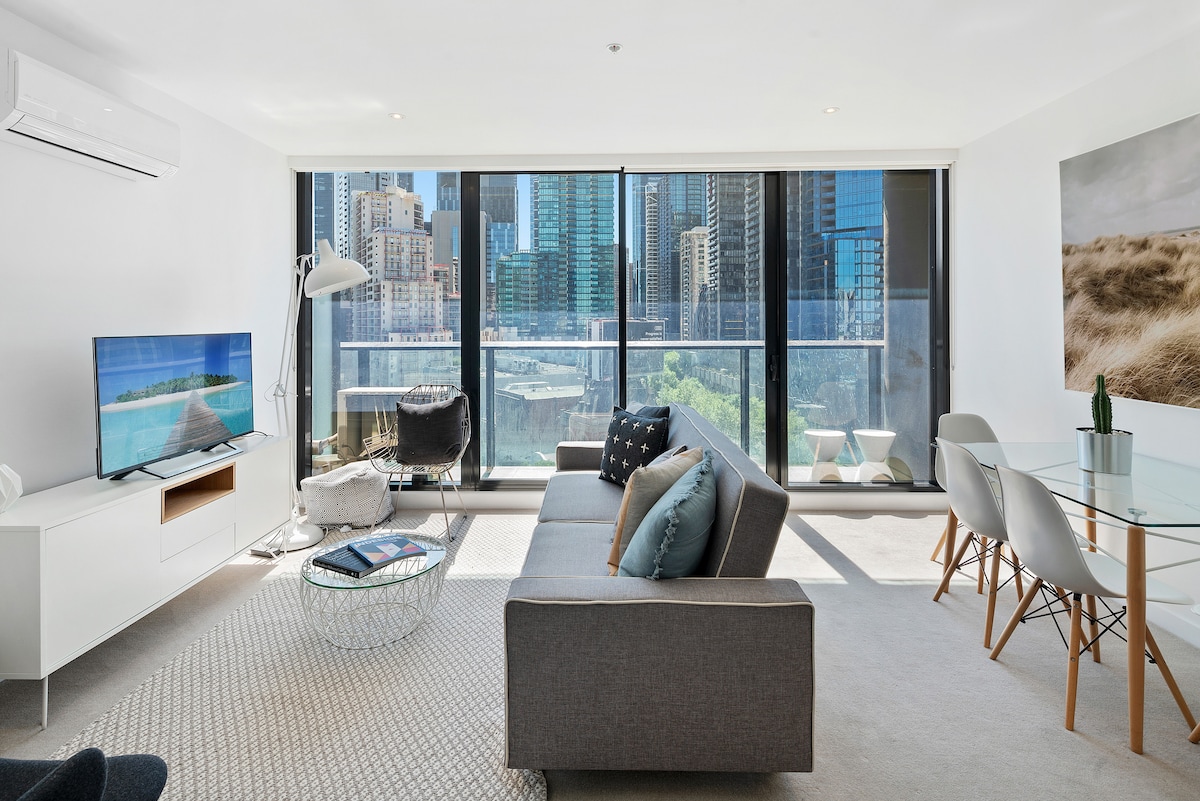 Enjoy a stylish, relaxed experience at this centrally located place. Try the top floor! In Melbourne CBD this place really stands out. Enjoy unencumbered views: the bay, river, Docklands, WestGate & Bolte Bridges, distant hills, city lights, phenomenal sunsets. Convenient. Walk to Crown, MConventionC, Marvel Stadium, Southern Cross Station, il Mercato Centrale. Great amenities. Pool/spa/sauna/gym. 1x quality queen bed + sofa 2x beds, linen, Hot shower, Kitchen, Ergonomic Desk, AppleTV.