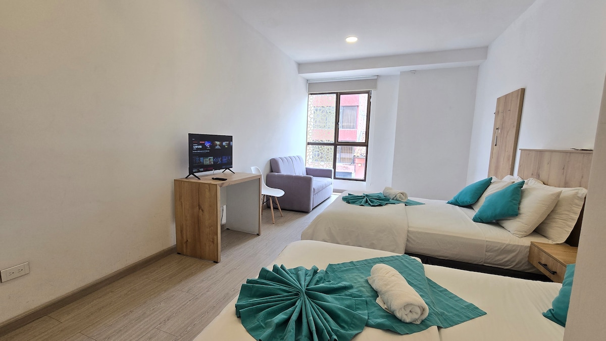 El Hotel Apart es espacio cómodo y acogedor, ideal para viajeros que buscan descanso, buena ubicación y comodidad. Nuestras habitaciones son amplias y están equipadas con baño privado, agua caliente, Wi-Fi rápido, Smart TV con más de mil canales, camas confortables, ropero y escritorio. Algunas incluyen cocina y nevera, ideales para estancias cortas o largas. Ofrecemos una atención amable y personalizada para que te sientas como en casa.