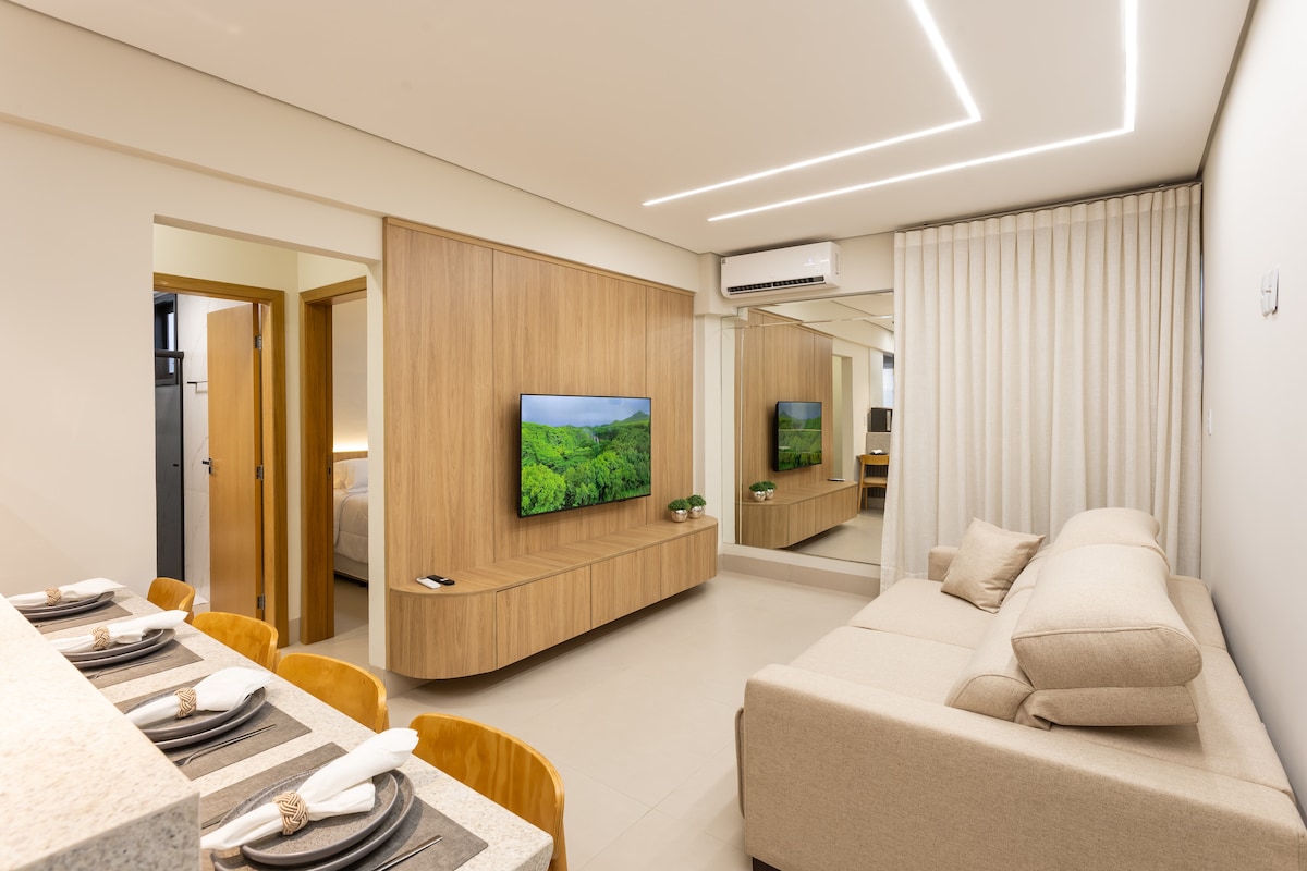 Conforto, segurança e diversão para toda família! Apto todo Climatizado com Cozinha Completa, Máquina de Lavar Roupas, 2 Smart TVs 55" e enxoval de cama e banho completo. Localizado em Bairro Nobre de Cuiabá, próximo do Shopping Pantanal, Centro Político Administrativo, Hospital São Mateus, supermercados e restaurantes. Condomínio Padrão Clube, com Piscina, Brinquedoteca, Sala de Jogos, Academia, Quadra de Futebol, Churrasqueira, Espaço Gourmet e um lindo jardim para contemplação!