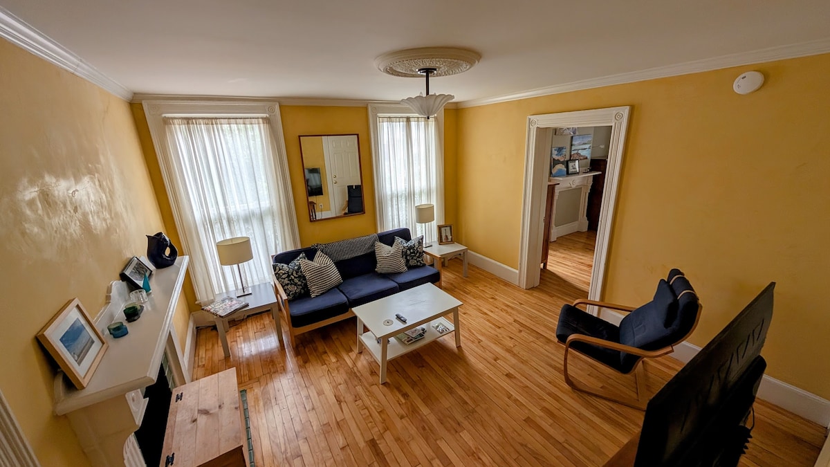 With the Portland Museum of Art and the State Theater a 5 minute walk away, the Old Port just 15, this stunning apartment is just steps from the best eateries, arts & shopping the city has to offer. When you arrive, park your car in the private parking space and forget about it for a while! Built in 1835, this sunny and spacious second-floor apartment features 14-foot ceilings and original hardwood floors. A his and her bathroom is linked with a walk-through stone tiled shower.