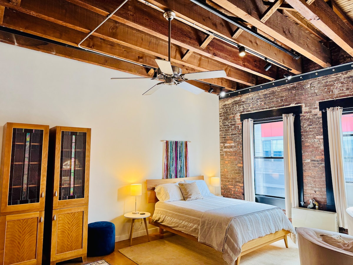 This charming one bedroom loft is in an ideal location on a quiet street in Portland. Built in the 1920’s, this old soul provides simplicity with the intention of comfort. Quiet, cozy and private this 550 sq. ft loft is on the third and top floor, thus the use of a two story staircase must be considered in addition to slanted walls around the perimeter of the space. Perks: Keyless Entry, AC, Strong Wifi, 55 inch TV w/Roku, organic sheets & towels, Kuerig Coffee & organic teas, and free parking.