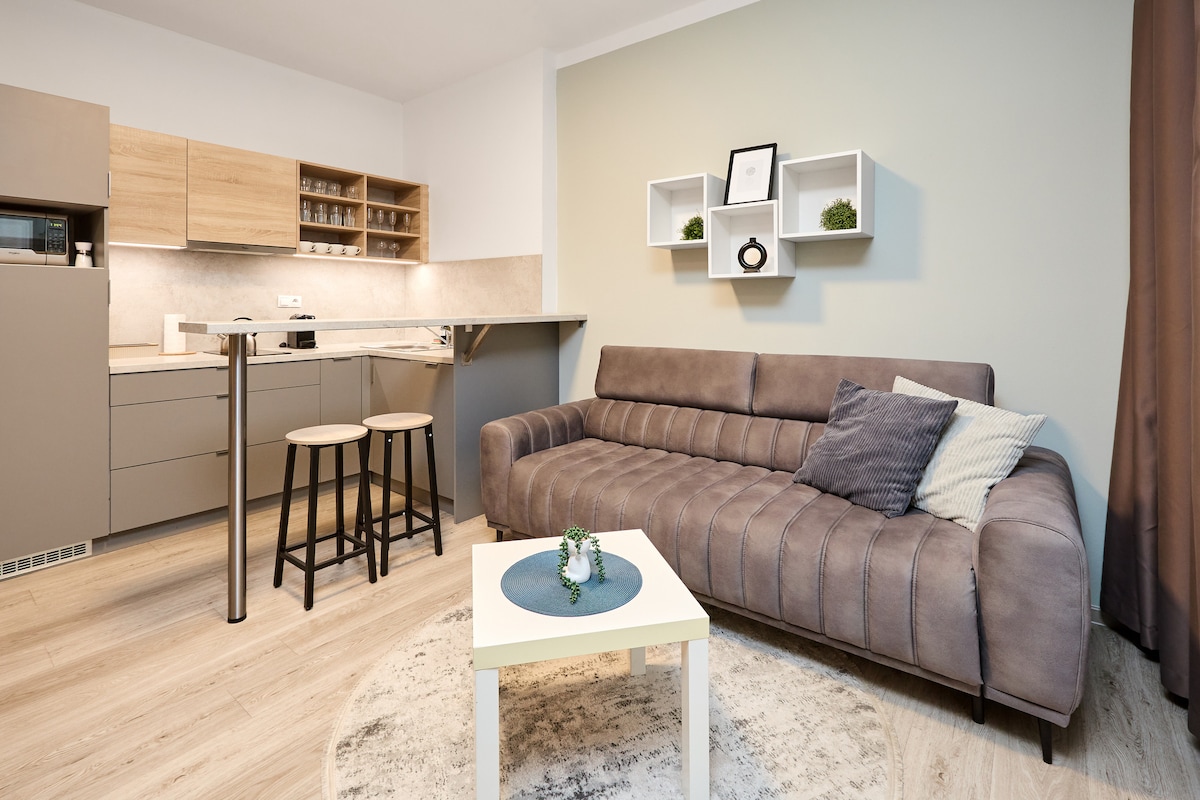 BRAND NEW RESIDENCE AND APARTMENTS!! The apartment offers comfort and a peaceful environment where you can relax after a day of exploring Prague's landmarks. With modern amenities and a cozy atmosphere, you will quickly feel at home. One of the main attractions is its excellent connection to Prague. You can reach the center of Prague within a few minutes. After a day of sightseeing, you can enjoy peace and relaxation in our pleasant apartment