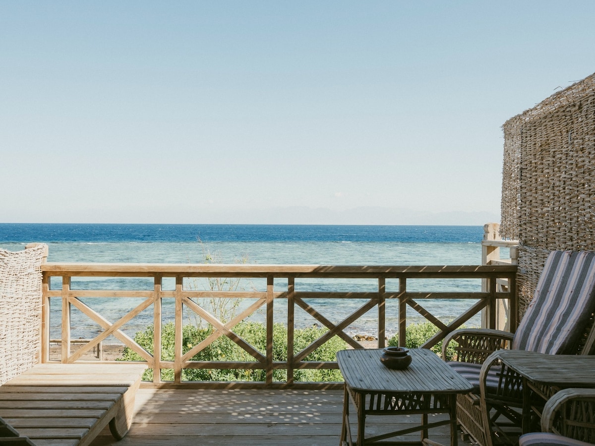 The private Cozy Beach Elite apartment boasts a beachfront location with full view& access of the Red Sea and the desert mountains. Perfectly situated in the quiet area of Eel garden directly adjacent to one of Sinai's most treasured diving destinations. This is our guests’ favorite part of Dahab, according to independent.