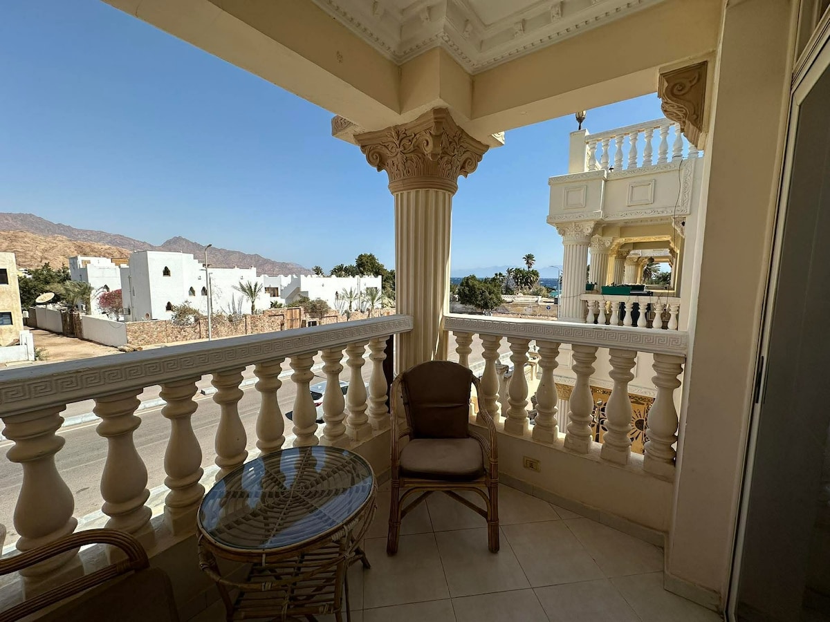 Relax and unwind in this cozy, fully furnished studio in the heart of Assala, Dahab. Enjoy amazing sea and mountain views right from your private balcony perfect for your morning coffee or a sunset wind-down. The studio features a comfy king-size bed, AC, smart TV, and a fully equipped kitchen with a stove, microwave, and all the essentials you need for a short stay or a longer escape. You're just a 2-minute walk to the sea and only 4 minutes from Assala Square