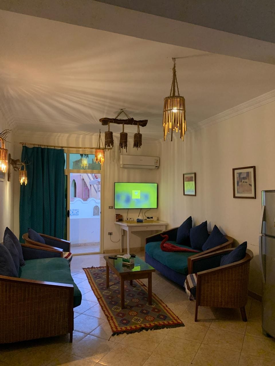 Clean, modern and Cosy Seaview 1 bedroom apartment in mashraba area near lagoona and CIB bank. In the best resort in dahab "bluehole plaza" Access to the roof for more panorama View on the charming city "dahab" - Can fit for 3 adults and 2 infants - 2 Air conditioner - Smart tv with Netflix and watch it - Dining table with chairs - Fully equipped kitchen with all you need kitchen tensiles - TV with satellite cable - High speed Wifi 32 mgb - Washing Machine - heating Shower