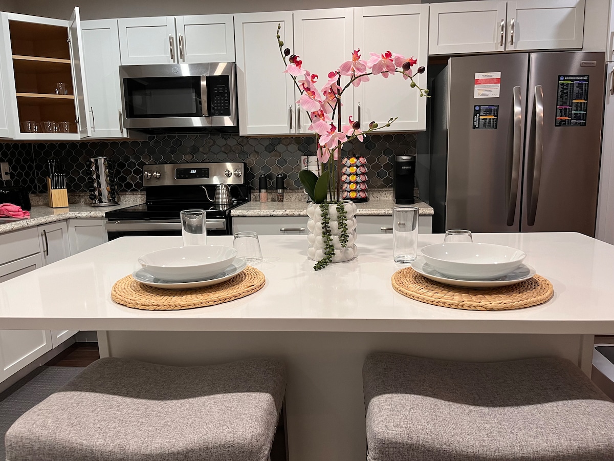 Meticulously decorated townhouse in downtown Arlington directly next to UTA!! Modern styled townhome with all you could need for your stay! 3 stories, with the first floor being the entry and garage. The 2nd floor opens up to the kitchen, living, and dining area to include the half bathroom, and all will not disappoint! The top floor is the split bedroom, and each has it's own private bathroom for guests to stay in comfortably and privately. There is sufficient soundproofing between units.