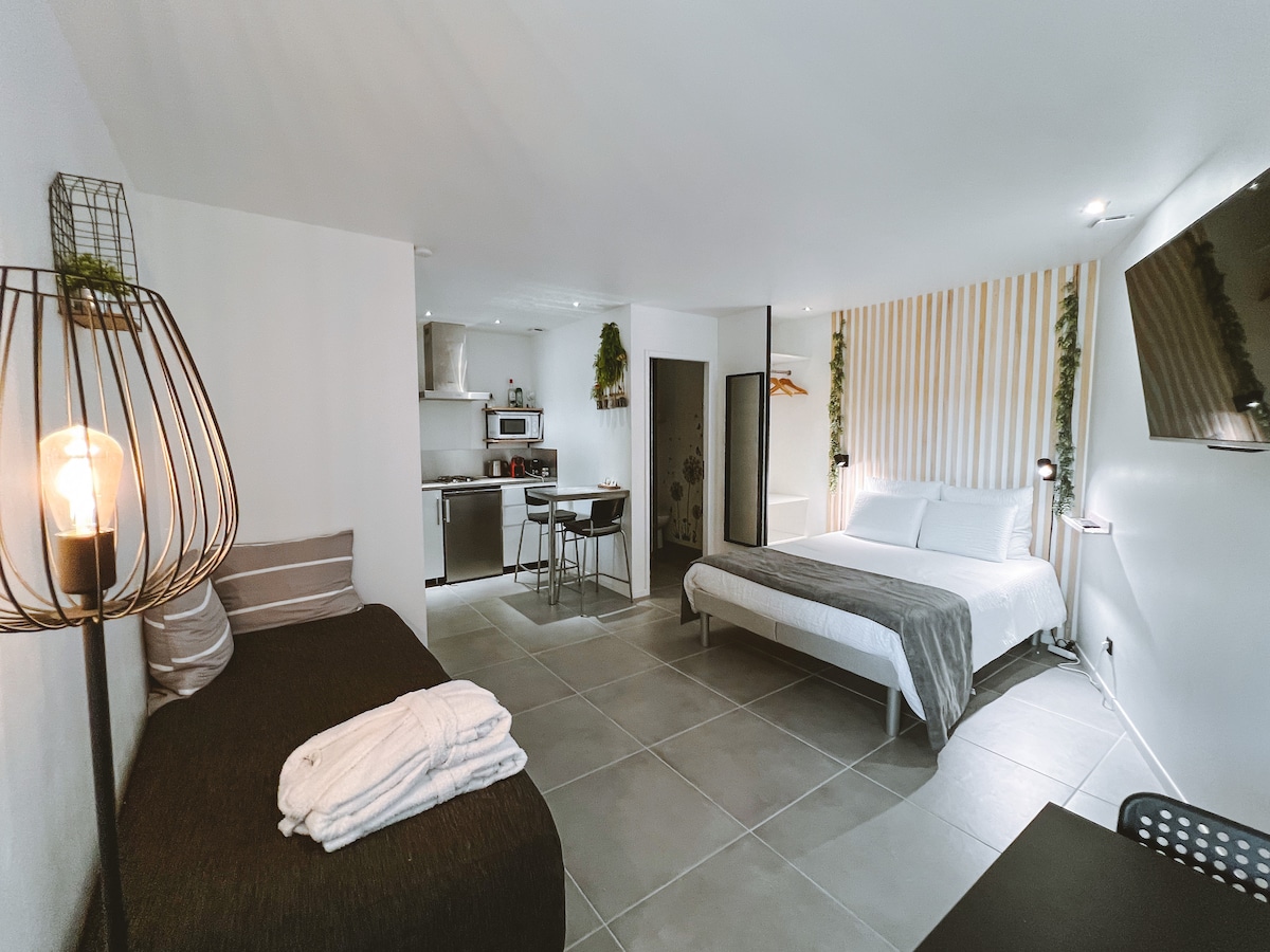 SPA actuellement a l arret en maintenance. Logement haut de gamme pour 2 personnes calme, sécurisé, indépendant confortable et stylé, 2 terrasses, grand espace vert, salle de sport, vélos, piscine, SAUNA 30 mn offert, jeu de petanque. Entièrement meublé, cuisine équipée, plaques induction, four frigo, vaisselle couvert cafetières bouilloire café thé. Lumineux, literie neuve 160x200, draps fournis, linges de toilette. TV gd écran 110 cm, internet, Parking intérieur sécurisé. Ballades, ping pong