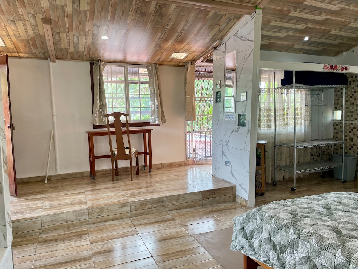 Conecta con la naturaleza en esta escapada inolvidable, acogedoras cabañas en Boquete, Chiriquí, rodeadas de naturaleza. Ambiente tranquilo y excelente ubicación para explorar Boquete. Esta cabina cuenta con una cama doble, terraza, baño propio. La cocina es un espacio compartido.