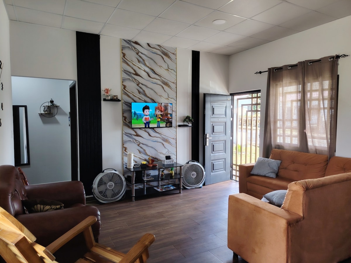 Comfortable house for 5 people, located 5 minutes from David and 15 minutes from Boquete. It has 2 bedrooms (1 double bed and 3 ¾ beds), full bathroom, kitchen equipped with water purifier, WiFi, large terrace, large backyard, covered parking, and private security. We accept pets so that the whole family feels at home. Close to Federal Mall and Plaza Terronal. We look forward to welcoming you for an unforgettable experience in a comfortable place with everything you need!
