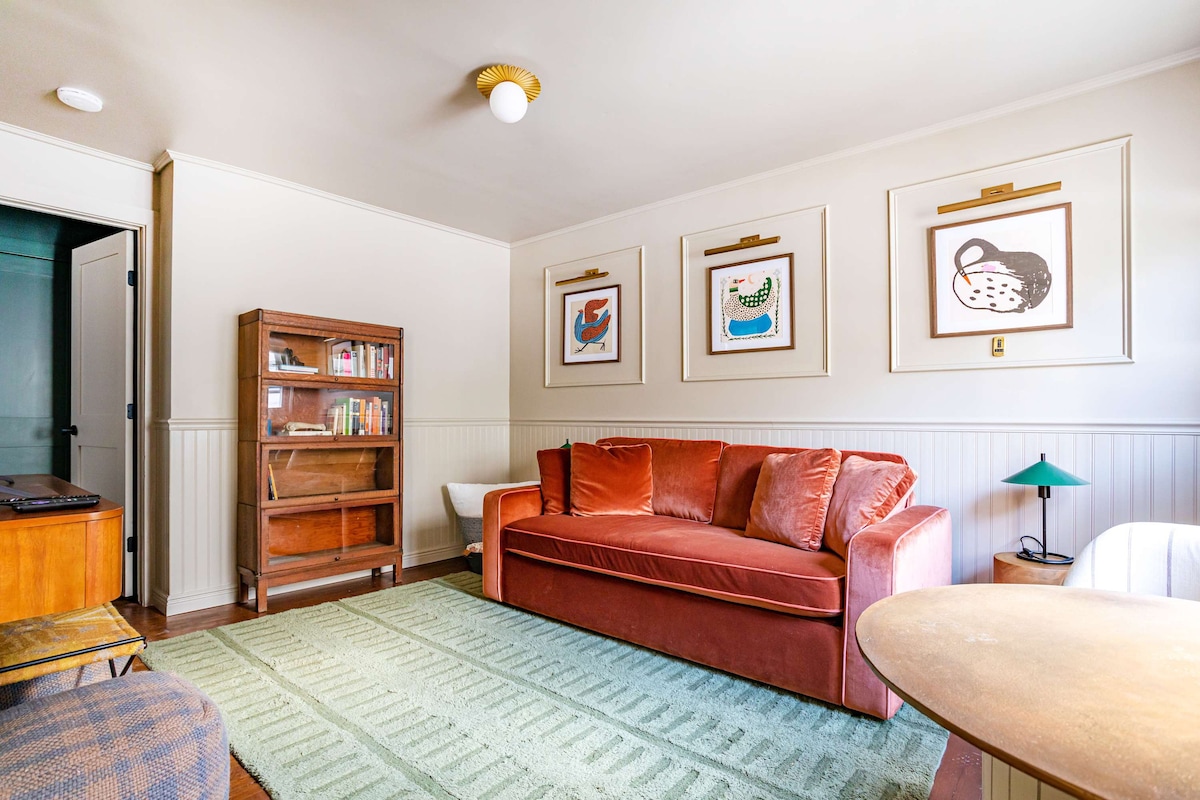 Enjoy nature in style at this fairytale in the forest. This idyllic escape combines whimsical structures, curated gathering spaces and a private wooded hillside surrounded by hiking trails and quaint towns. Disclaimer: This is a rustic cabin. Heating is from a wood-burning stove, there is no AC. The bath house is a separate structure from the cabin, up a hillside with stone steps. Cooking is via charcoal grills, small outdoor kitchenette or fire.