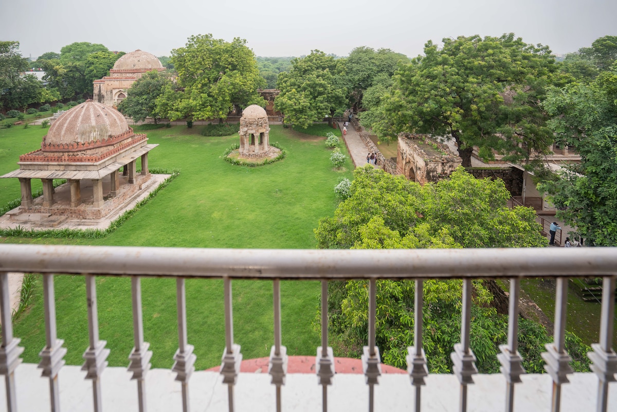 Call it stylish and spacious at this centrally-located barsati(rain room on top of the house). This chic room is on level 2 of our haveli which is more than 150yr old, Situated 100mtrs away from green park metro station. Yes! You read it right. Only 100mts away. In the middle of ever buzzing south Delhi, we offer a quite and quaint open space where you can relax, rejuvenate and feel inspired. Our panoramic balconies take you back in time, to reminisce the good old days. Disclamer: HIDDEN GEM !!