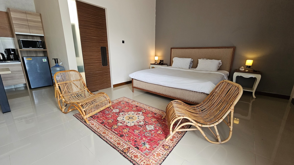 The Bale Dangin Bungalow is a spacious standalone unit within the Canang Sari Homestay, nestled in a Balinese tropical house. Featuring a veranda overlooking lush tropical gardens, a private bathroom, kitchen, and toilet. Enjoy free breakfast supplies like cereals, milk, noodles, and eggs for your first morning. During your stay join our Walking Tour, Textile Tour, Wellness Class, or Cooking Class. Contact us if this room is booked or if you need a smaller room for a solo or couple.
