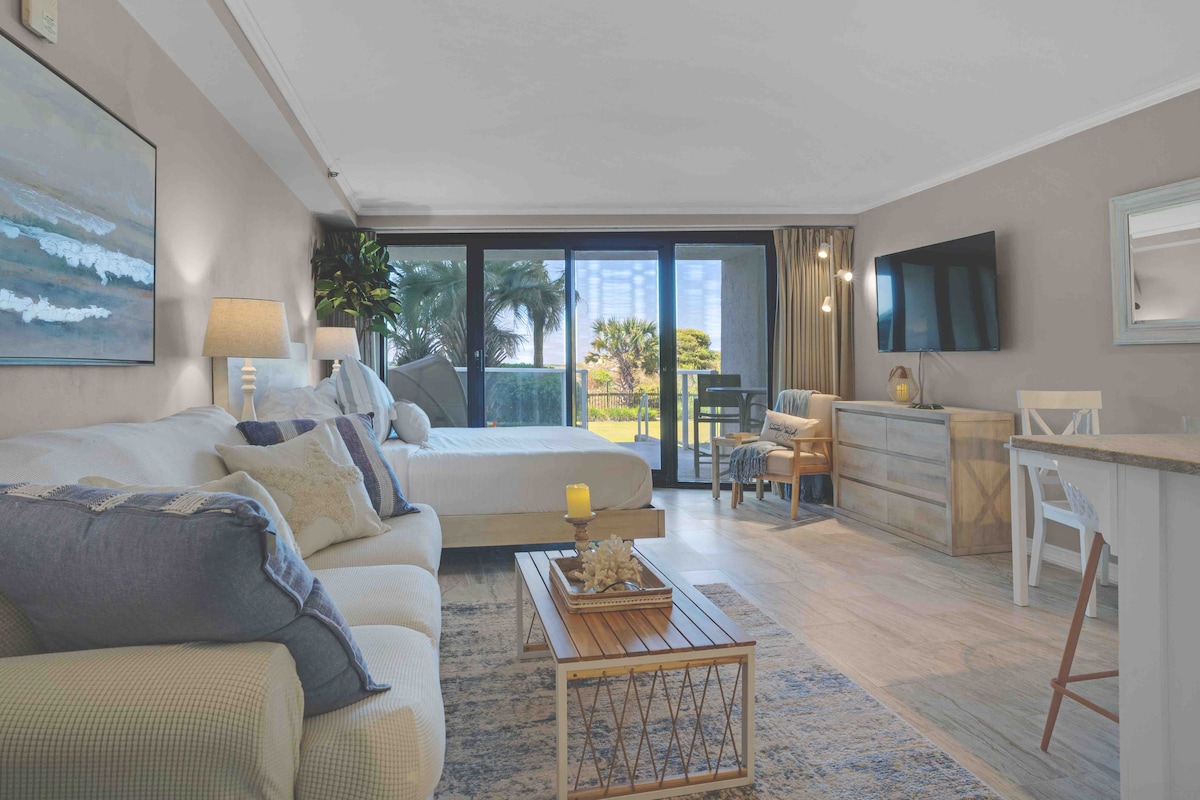 Airy 1st floor Sleek studio ON Beach. 🛺 Golf cart w/3+ nts. In Sandestin Resort between Destin & 30A. NEW Pool & Hot Tub! West Elm furniture & King bed with tropical view. Relax on the patio’s Bali bed & listen to the waves. WiFi & 55” smart TV. Kitchen w/coffee cart. Washer/dryer. Enjoy free gym, tram, beach, trails, golf, dining, shopping & entertainment all without leaving the resort! Perfect honeymoon, baby moon, romantic getaway, girls trip, solo travel or lil’ fam vacay! *NO animals