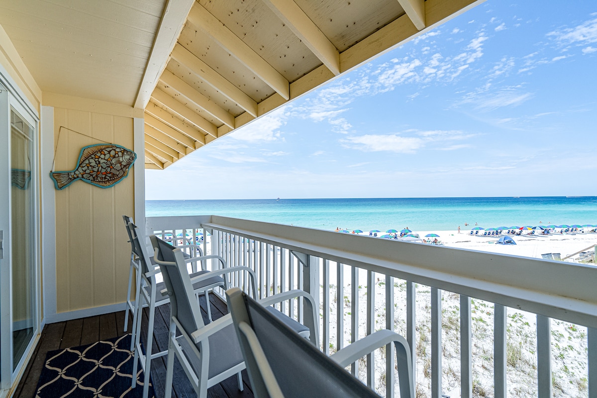 Beachfront top floor unit, on a private beach, in two story building gives unobstructed sunset/ocean views. Located on soft white sand with on-site free parking. Perks of choosing this unit include gated resort with pools, beach service included (Mar.-Oct.), tennis courts, pickle ball, and par 3 golf course (included). Unit has fully functional kitchen and wifi included. Master bedroom beach/sunset views! Sleeps 4 adults with use of sofa bed in living area and additional cot-sized bunkbeds.