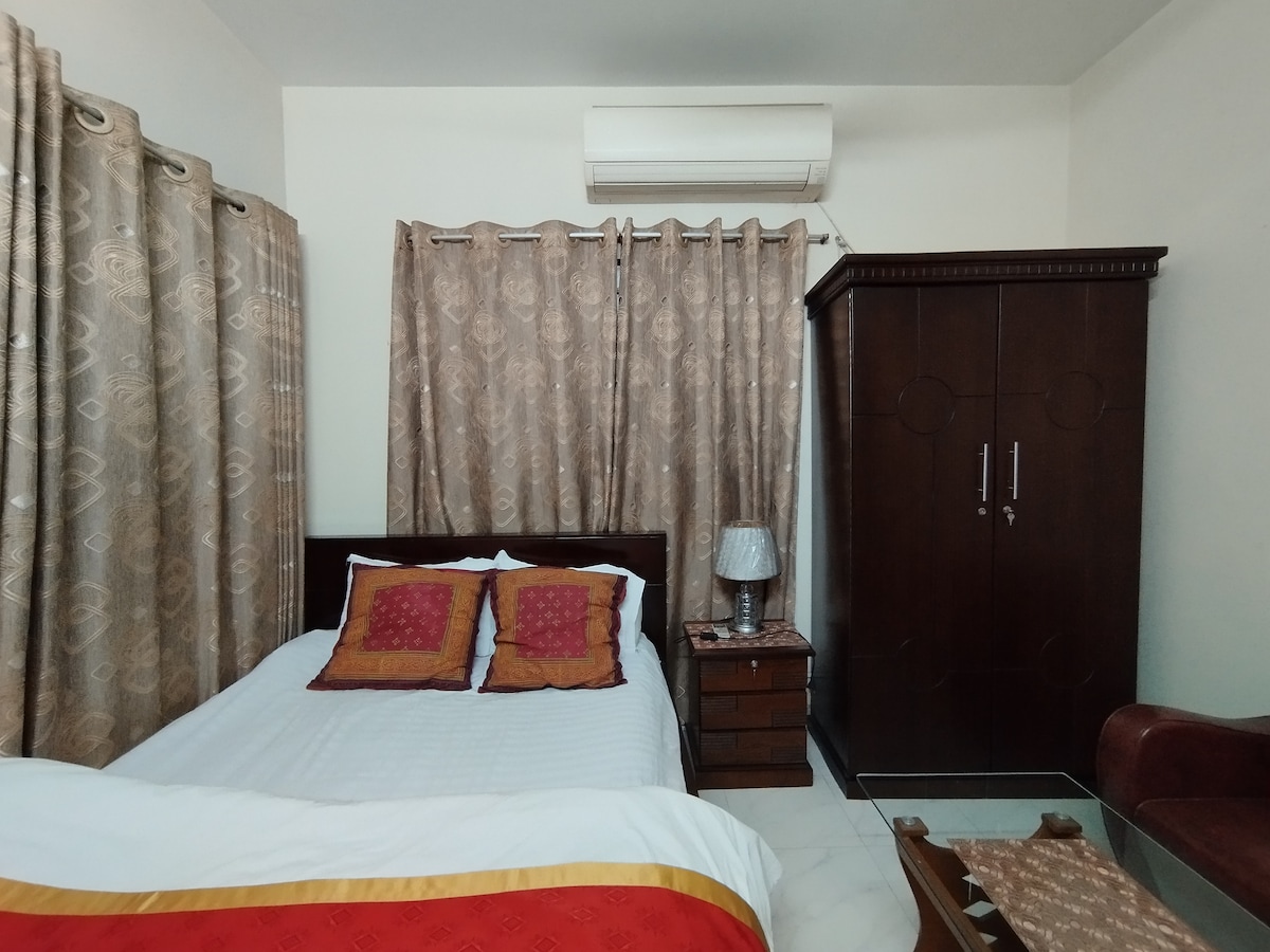 This cozy 4th-floor home combines comfort and convenience with a bright bedroom, wall cabinet, seating area with TV, prayer room, workstation, and dining space. The kitchen includes a fridge, oven, and HI-TECH water filter for easy living. Essentials like geyser, Wi-Fi, and AC in both bedroom & living area ensure comfort. Located next to Gulshan Aarong outlet and walking distance to food shops, it’s perfect for quiet reading, working from home, or simply relaxing for maximum 2 people.