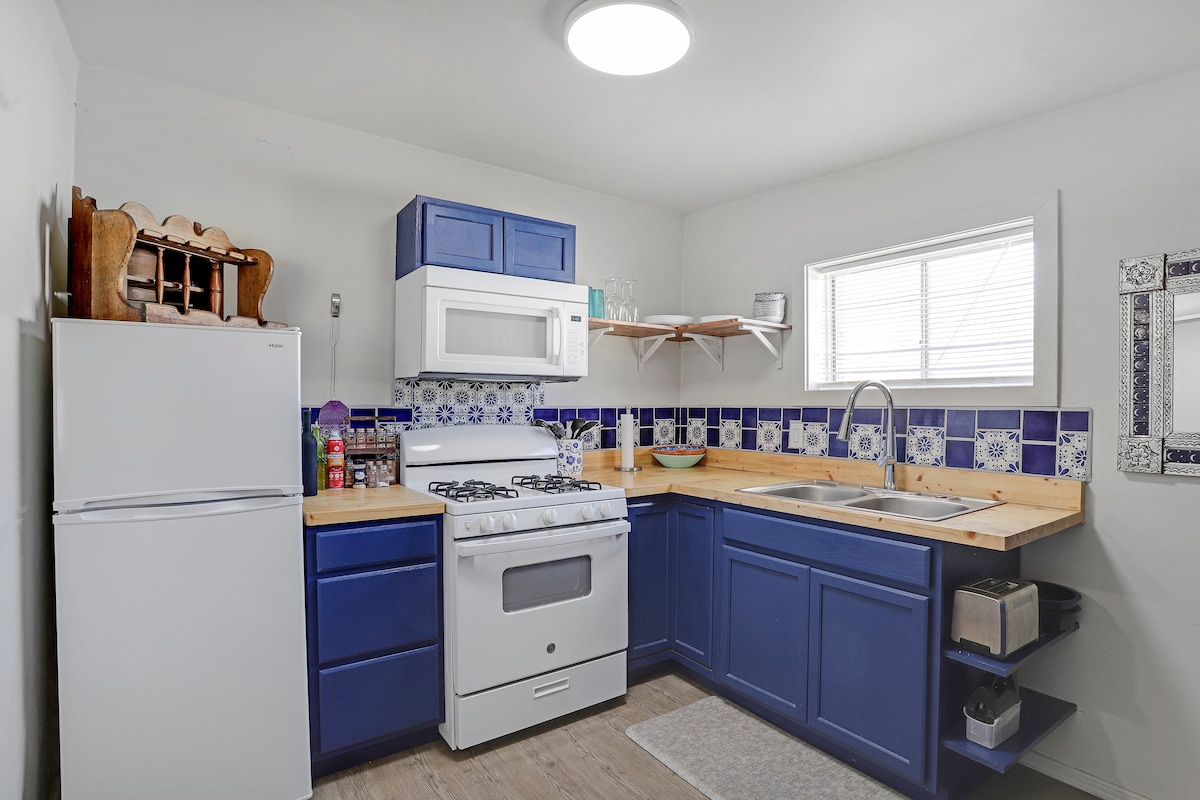 Clara’s Nest is in a 1880's adobe compound with its own private entry, courtyard, original stone floors, handcrafted beams, hand-painted bird & flower motif throughout. The suite features a king bed, cozy loveseat & ottoman in the sleeping area, dining table & 4 chairs, kitchenette with micro, fridge, coffee & tea bar, a separate living room with sofa, TV, private bath. Outer space includes: covered patio, backyard, pool and hot tub area (heated upon request) No stove.