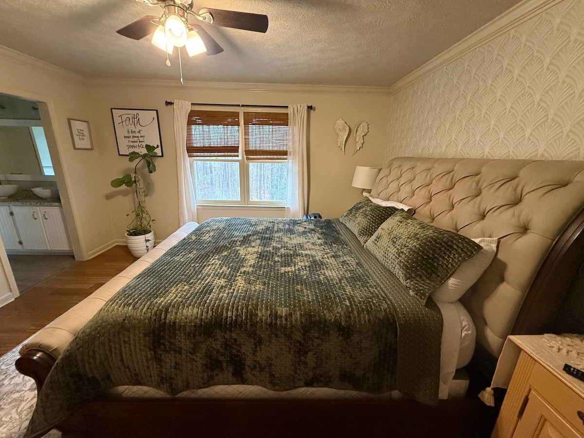 Newly launched, be among our first guests. Enjoy intro pricing on a private apartment attached to a larger home w/ two king bedroom suites, cozy living spaces, and peaceful outdoor patio. Our Atlanta Suite has its own private entrance and offers privacy while remaining part of a peaceful, wooded property. Perfect for couples, creatives and quiet getaways. Fully equipped kitchen. Laundry Room with comp. detergent. Bathroom stocked with essentials. Outdoor patio seating for morning coffee.