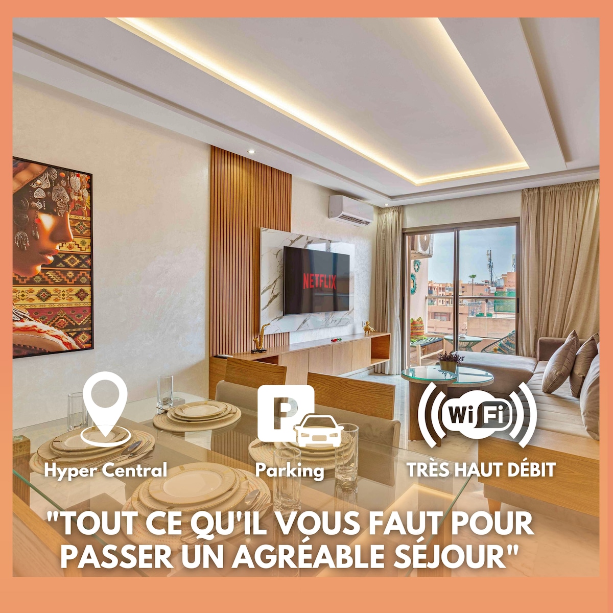 With 100% positive reviews, this unique apartment is one of the most loved stays in Marrakesh, combining central location, comfort, and style. Every detail curated to make your stay unforgettable. • Prime Location: In the heart of city center • Safe & Secure: Modern building with 24/7 security and free private parking • Calm & Comfortable: Bright, fully equipped and quiet apartment with air conditioning and hotel-quality bed • Local Touch: Insider tips to explore Marrakesh like a local