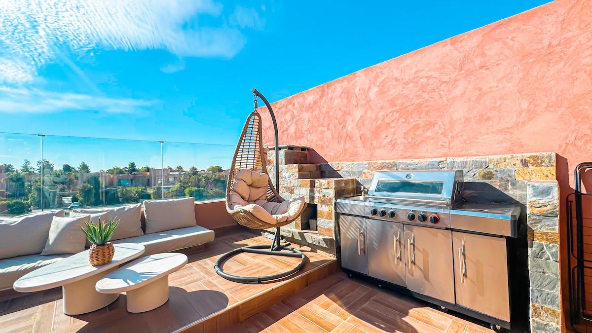 A sunny haven in the heart of the Palmeraie 🌴 Bright 82 m² top-floor apartment with 2 bedrooms (one with king-size bed), fully equipped kitchen, living room, walk-in shower, and 3 large terraces with open views. In a gated, secure residence with 2 large pools, water features, and lush gardens spread over several hectares. 10-minute walk shops, restaurants, cafés, and a pharmacy. Perfect for couples, families, or friends seeking peace, greenery, and quick access to the city center (15 min away)