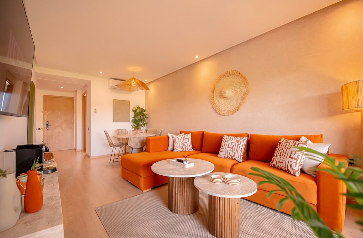 Profitez de ce magnifique appartement moderne et décoré avec style par l'artiste Marocain NICH, situé au coeur de la résidence sécurisé Prestigia avec piscine et parking . 2 chambres, 2 sdb, grand salon, Smart TV, fibre, Netflix. Serviettes, shampoing, gel douche sont fournis. Femme de ménage dispo (sur demande). À 3 min du restaurant et bar Montgommery du golf, à 10 min en voiture de l’aéroport, Menara Mall, Hivernage, Mazar, et à 15 min de la Médina/Guéliz. Vue sublime, calme et confort