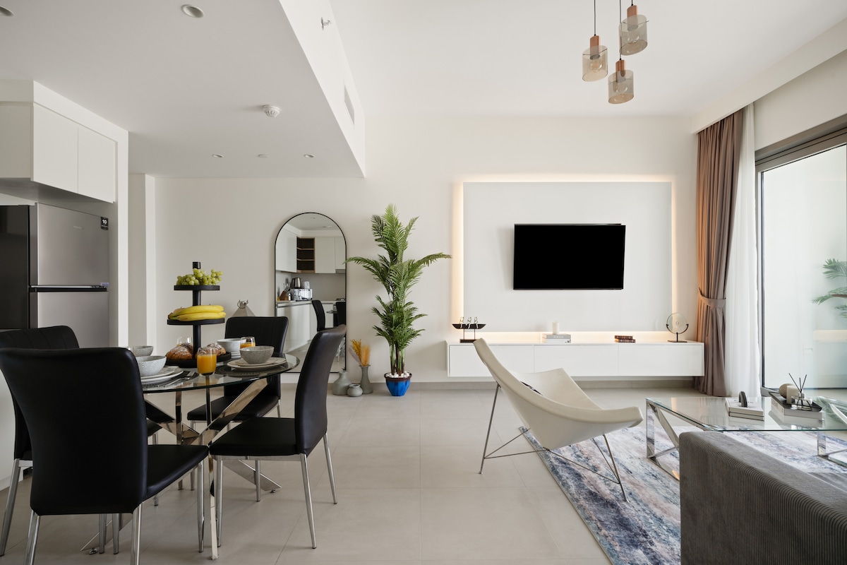 Indulge in luxury at this brand-new, ultra-modern apartment with full lake views and iconic sights of Ain Dubai. Located just 50 meters from the metro, you're only 5 minutes from the Marina and Marina Mall, and a 20-minute walk to the beach. Surrounded by restaurants, supermarkets, and pharmacies—all within a 5-minute walk. Peaceful and stylish, it comfortably hosts 4 guests, offering high-end finishes, private parking, and a truly convenient, upscale stay.