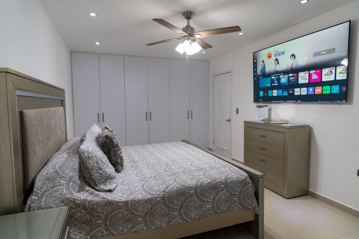 Estacionamiento privado Smart tv Planta baja Amplios espacios Zona muy segura Silencioso Cocina equipada Internet de gran velocidad Entrada autónoma 8 min del centro histórico 10 min de la FENADU 10 min Central camionera 25 min del aeropuerto Muy bien comunicado, cerca súper mercados, restaurantes, gimnasios y tiendas de autoservicio Calentador solar Alojamiento no compartido