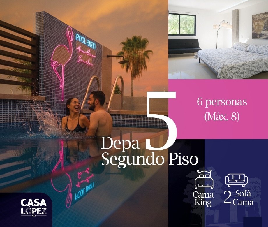 Are you visiting Mazatlan? Great. Apartment 5 has what you need: ✔️On the second floor 🔒In a secure building, you access with codes 🛏️1 king bed ideal for 2 🛋️2 sofa beds -CAP.: 6 (2 x bed). -MAX. CAP. 8 (+1 inflatable mattress)* With an additional cost of $300 MXN per night 🚽Full bathroom 🌬️Minisplit AC unit 🥄Equipped kitchen 📺Smart TV 🚀Internet Close to Zona Dorada and a few steps from the main avenue to get a taxi. Close to Soriana and Walmart restaurants.