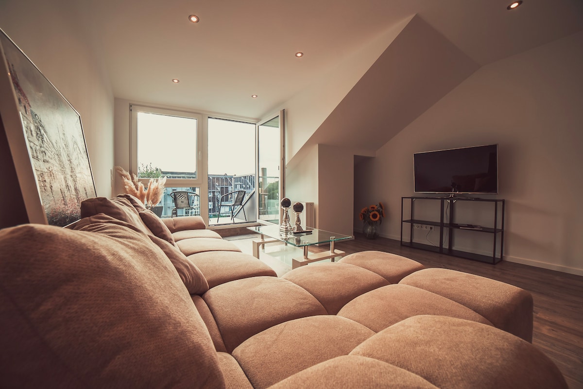 Dieses moderne Penthouse im Herzen der Stadt verbindet urbanes Leben mit echter Entspannung. Auf 86 m² erwartet dich ein stilvolles Zuhause mit Kamin, Heimkino und privater Dachterrasse & Whirlpool. Die Fußgängerzone ist nur 500 m entfernt, Königsallee und Altstadt erreichst du in ca. 10 Minuten – zentral und dennoch angenehm ruhig. Im Schlafzimmer laden dich eine freistehende Badewanne mit TV sowie ein King-Size-Bett (2×2m) zum Abschalten ein. Ankommen. Abschalten. Düsseldorf genießen.