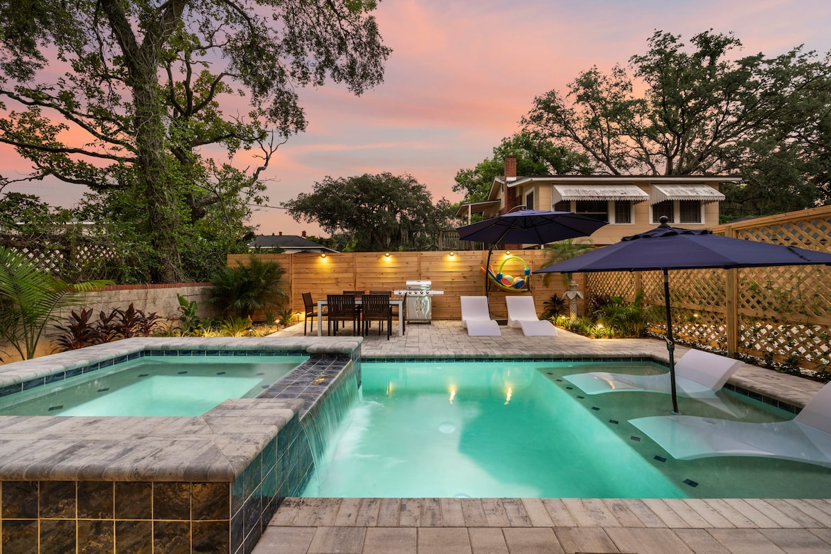 LJ’s Beach House is located in beautiful North Jacksonville Beach. The House offers 3 bedrooms/2 full baths. Sleeping arrangements can comfortably accommodate up to 8 people and provides the perfect getaway, family vacation, office retreat or just time away from the daily grind. The outdoor area is a tropical oasis where you can relax/unwind. Backyard includes a large pool, connected hot tub, fire pit, large covered porch and ample outdoor seating. Please note that we do NOT allow parties.