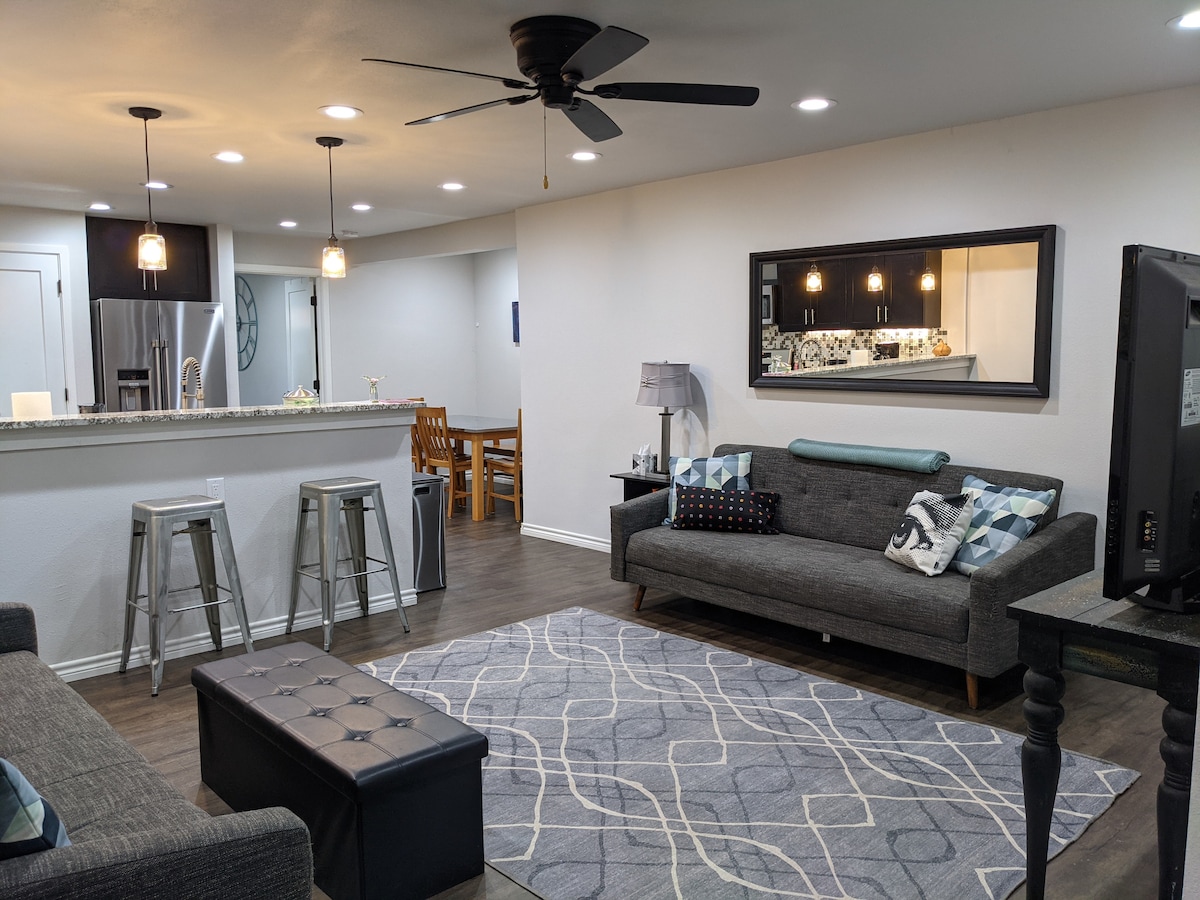 Hey Ya'll! Welcome to our Austin Master Guest Suite remodel. We are 4 miles from the the new Q2 Soccer stadium, Domain, Dell, and Samsung. Only 15min to downtown, Formula 1, Lake Travis, Greenbelt, and Austin Airport. This is a convertThe living space is filled with everything you could need on your trip including a small kitchen with sink, microwave, mini-fridge, coffee, tea, private patio with table, and a brand new luxury bathroom. We offer longer-term and extended stays now at a 25% discount