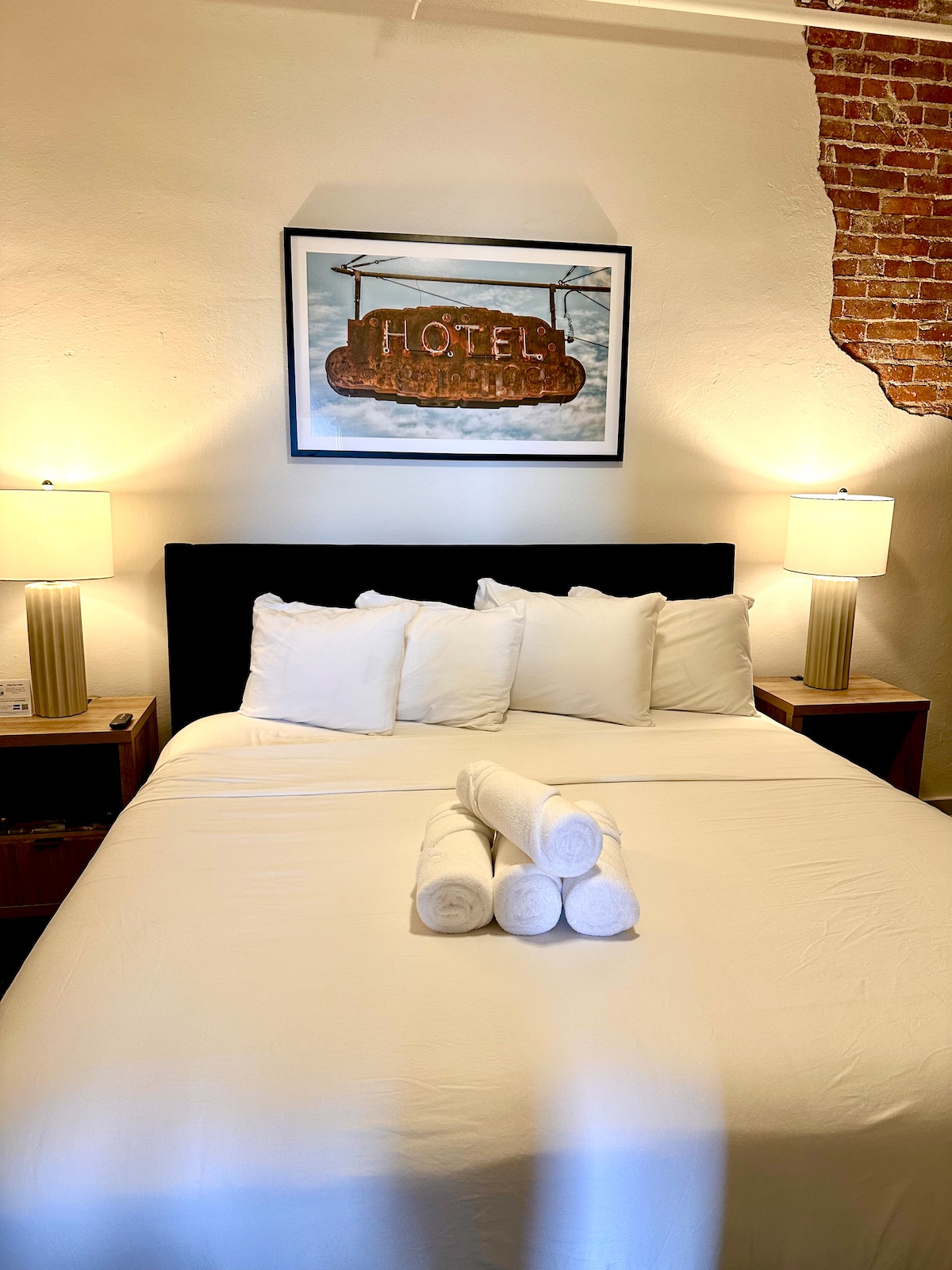 Palooza Basecamp Hotel is a newly remodeled, and refreshed 100 year old building. The rooms sport local artwork highlighting the area's beauty while comfortably accommodating your needs with adjustable beds, 50in TV's, walk-in showers, and backlit mirrors. A wide community hallway is flooded with natural light from skylights, while a cozy mountain feel is maintained. All rooms have access to additional amenities, and are in close proximity to mountain adventure. Room 05 has a queen sized Bed.