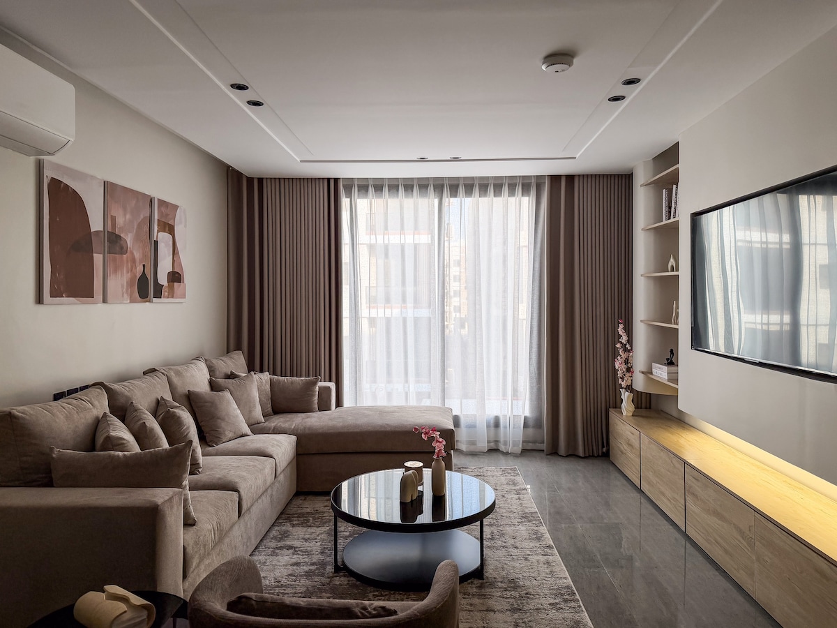 شقة حديثة بموقع مميز! تضم غرفتين وصالة، مطبخ مجهز، وصالة طعام، مع دخول ذكي، شاشة سمارت، وإنترنت سريع. تبعد 400 متر عن جسر البحرين و5 دقائق عن البحر، وقريبة من كل الخدمات. مثالية للإقامة المريحة بتصميم عصري A modern apartment in a prime location! Features 2 bedrooms, a living room, a kitchen, and a dining area, with smart entry, smart TV, and high-speed internet. Just 400m from Bahrain Bridge, 5 minutes to the beach, and close to all services. Ideal for a comfortable stay in a sleek design.