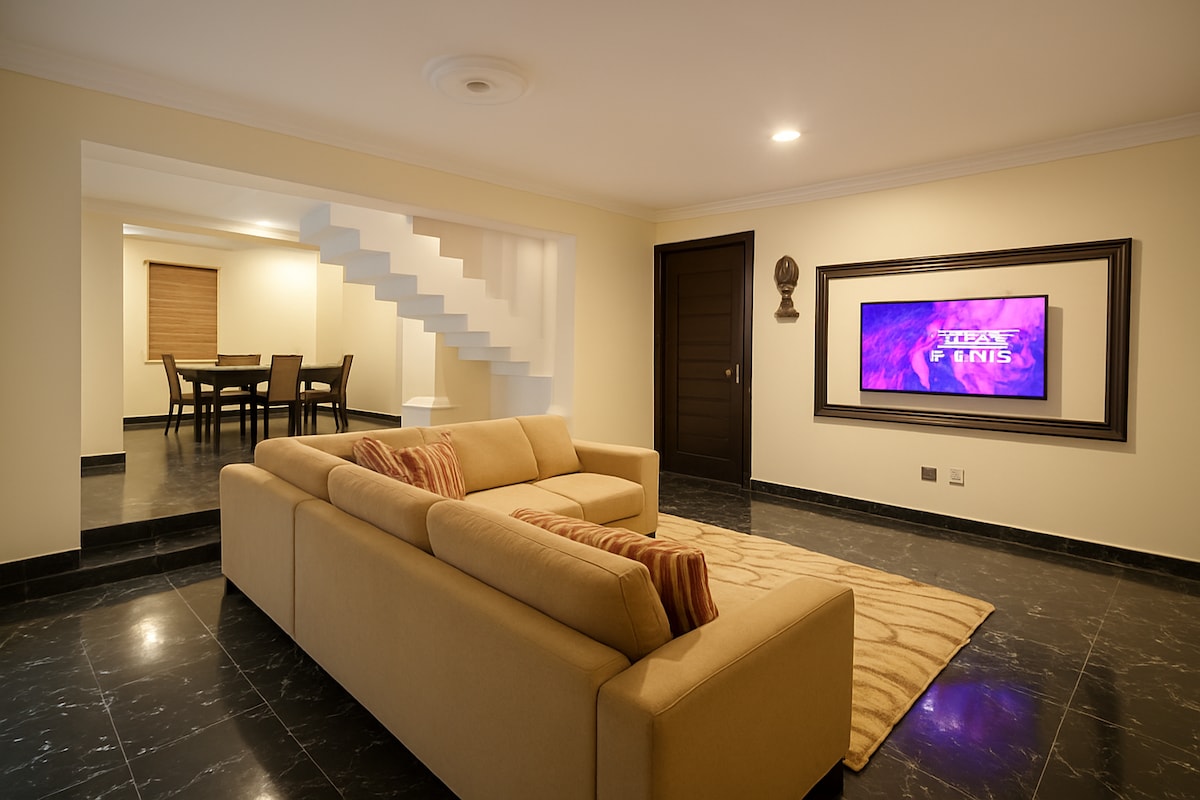 Have fun with the whole family at this stylish place. House is located in a beautiful area, peaceful and well-planned developing area. We have Restaurants, commercial swimming poll, Clinic, Bakery, pubs, night club in the area. We are about 50KM from Royal Senchei Hotel and other nice hotels in the Aksomobo Area. Close to Tema for all fun and social activities you want to have.